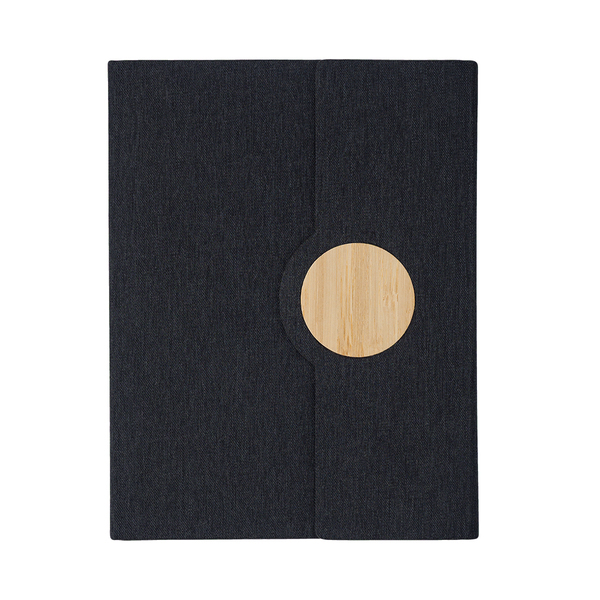 Elegancki notes w linie ( 80 arkuszy 70 g/m²) w twardej oprawie z tkaniny RPET, ozdobiony bambusowym elementem. Posiada uchwyt na długopis. Zamykany na magnetyczne zapięcie.